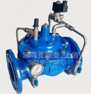 當(dāng)電動(dòng)控制閥從進(jìn)口端給水時(shí),水流流過(guò)針閥進(jìn)入主閥控制室,當(dāng)電磁導(dǎo)閥找開(kāi)時(shí),控制室內(nèi)的水經(jīng)電磁感應(yīng)閥,球閥流出。球閥開(kāi)度大于針閥開(kāi)度,主閥控制室內(nèi)壓力很低,主閥外于全開(kāi)狀態(tài),當(dāng)電磁導(dǎo)閥關(guān)閉時(shí),主閥控制室的水不能流出,控制室升壓,推動(dòng)膜自關(guān)閉主閥。